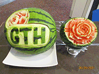 福岡市でソープカービングとフルーツカービングの教室をされている大原さえこ先生にお越しいただきました。 カービングとはナイフ1本で彫刻することで、ソープカービングとは石鹸彫刻のことです。 手際よくスイカに彫刻される様子にご入居者は釘付けでした。 GTH(グッドタイムホーム)という文字と、薔薇の彫刻をして頂きました。 コロナ禍で久しぶりのイベントとなりましたが、皆様とても喜ばれていました。 |